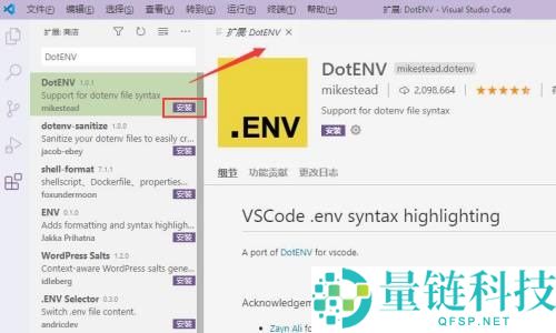 6、最后点击“DotENV”即可在右侧查看插件详情,点击右侧的“安装”按钮即可安装该扩展。