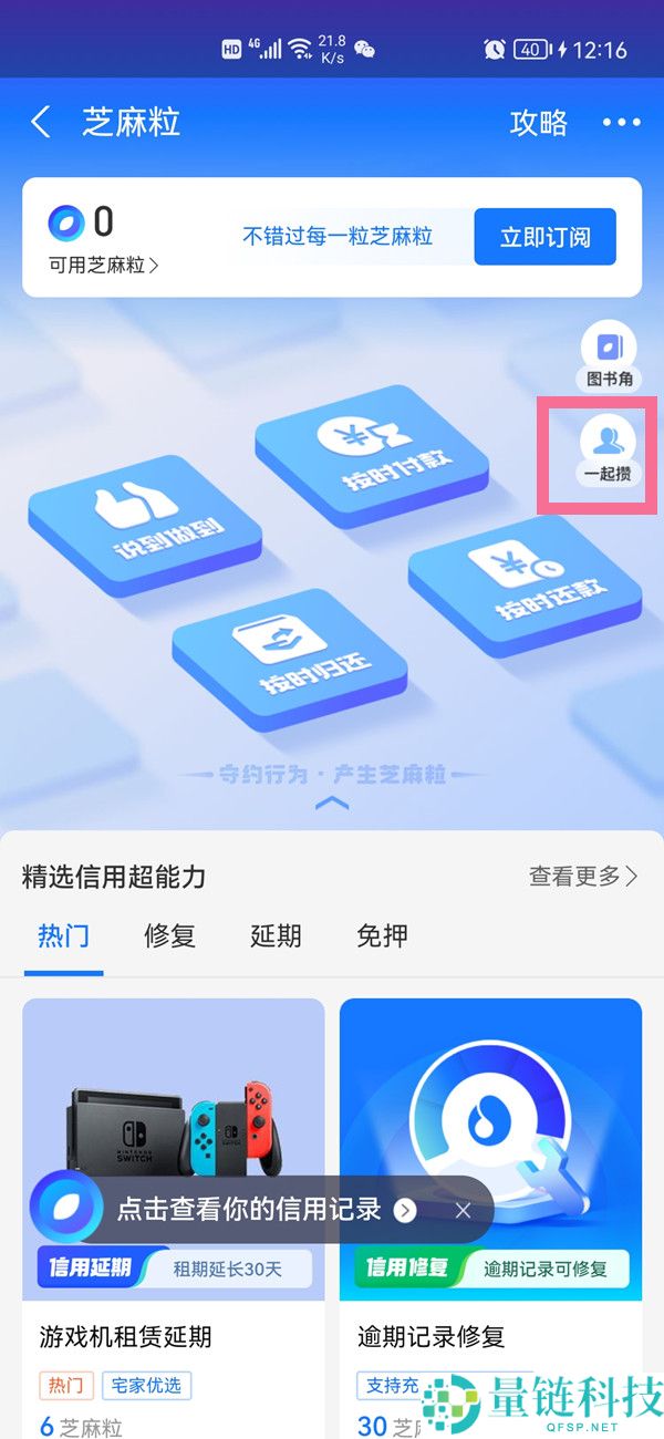 2、在“芝麻粒”页面点击【一起攒】即可。