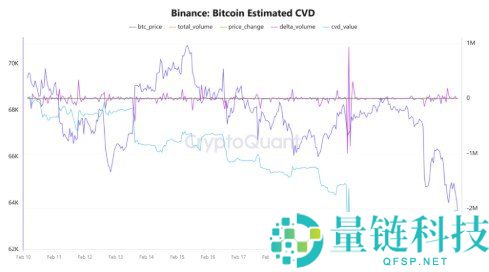 币安上的比特币「预估累积成交量差(CVD)」数据反映了近期的买卖行为,显示卖压正持续增强,CVD 数值已达到约-255 万,显示卖单力量已明