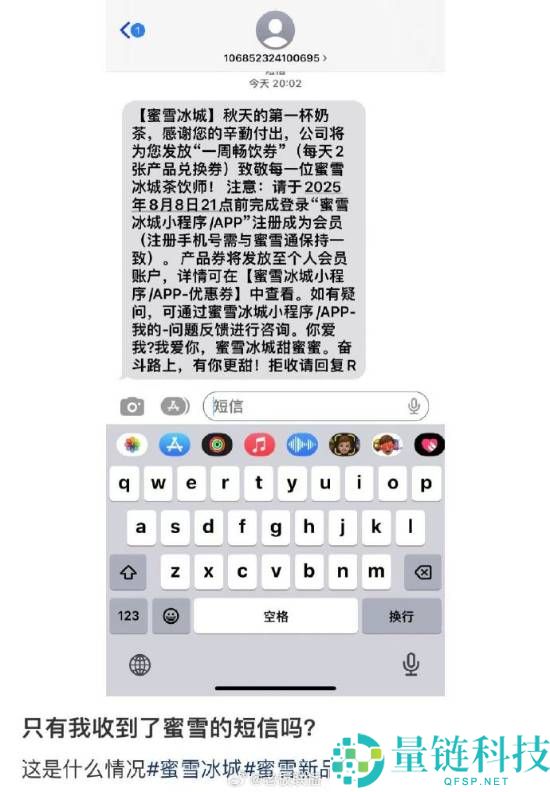 8月8日晚,多名疑似蜜雪冰城员工在社交媒体晒出短信截图,称公司将发放“一周畅饮券”回馈员工。短信内容显示,为感谢员工的辛勤付出,蜜雪