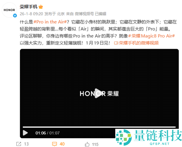 1月8日消息,日前,荣耀产品线总裁方飞透露,荣耀一款既Pro又Air”的手机即将与大家见面。今日,荣耀手机官微发布预热视频,正式官宣新机命