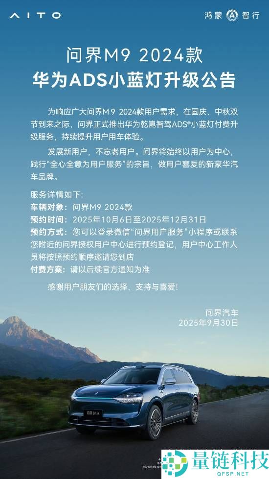 2024款问界M9智驾小蓝灯晋级计划出炉:限时优惠价7500元