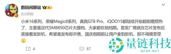 7月31日消息,博主数码闲聊站表示,小米16系列、荣耀Magic8系列、真我GT8 Pro、iQOO15都陆续开始超前瞻预热,主要是这代骁龙8 Elite 2芯