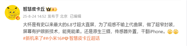 9月6日消息,小米集团总裁卢伟冰确认,小米16系列发布会提档,相关话题华为小米发布会前后夹击iPhone”引发热议。有网友表示,华为苹果小米
