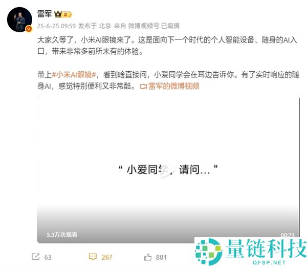 小米预告AI眼镜 雷军:自带小爱同学 啥都能直接问