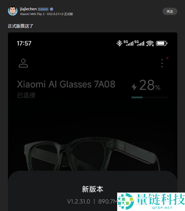 9月7日消息,日前,小米社区有网友发帖称,小米AI眼镜发布1 2 31 0正式版固件更新,固件包大小890 7MB。据了解,此次更新的功能包括发布会