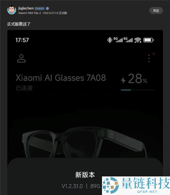 快科技9月7日消息,日前,小米社区有网友发帖称,小米AI眼镜发布1 2 31 0正式版固件更新,固件包大小890 7MB。据了解,此次更新的功能包括