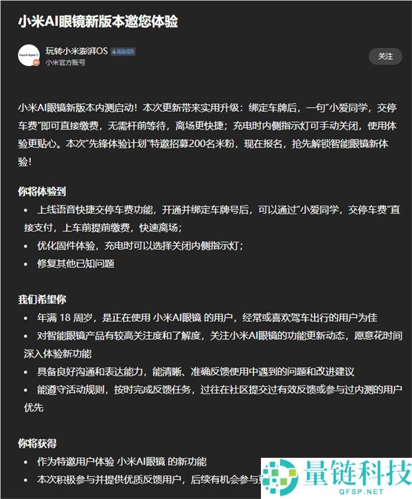 12月11日消息,今日,小米官方账号玩转小米澎湃OS”发布公告,宣布开启小米AI眼镜新版本内测。本次先锋体验计划”招募200名米粉,预计将于1