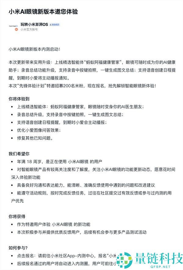 1月19日消息,小米官方今天在小米社区发文,开启小米AI眼镜新版本内测招募,特邀200名米粉,预计在2026年1月21号统一审核。本次更新主要是