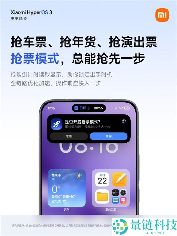 2月1日消息,日前,小米澎湃OS官微宣布,抢票模式现已覆盖更多机型,添加抢购日程后,抢购前自动提醒,岛上读秒倒计时,倒计时1分钟开启系