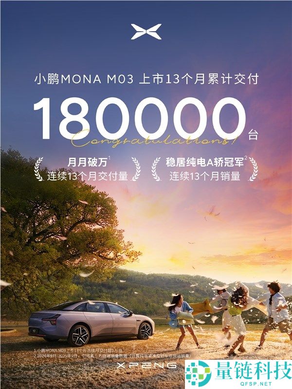 9月28日消息,小鹏汽车今日宣布,小鹏MONA M03已累计交付180000台。上市13个月,连续月交付量超1万台,并连续13个月获纯电A轿销量冠军。据