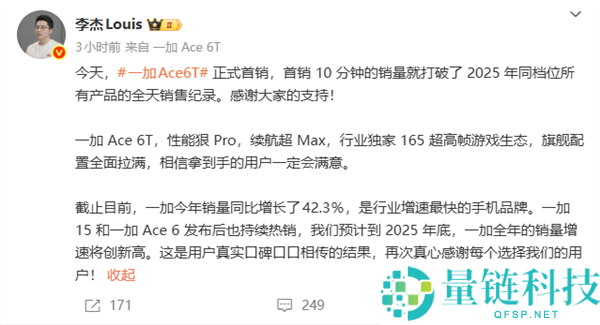 12月5日消息,今日,一加Ace 6T正式首销,起售价2399元。新机发售后,一加中国区总裁李杰宣布,一加Ace 6T首销10分钟的销量就打破了2025