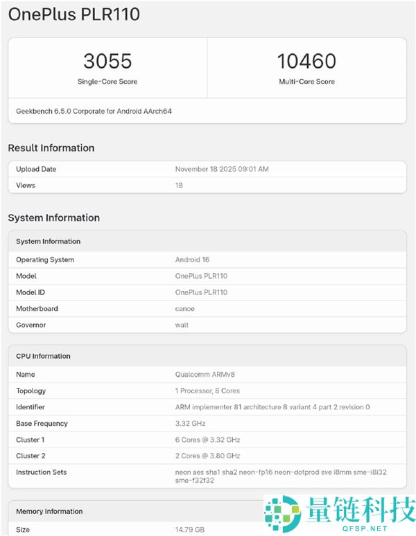 11月19日消息,日前,一加一款型号为PLR110”的新机跑分现身Geekbench数据库,博主数码闲聊站”透露该机正是一加Ace 6T,这也是高通第五代