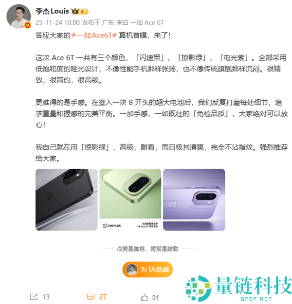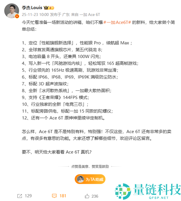11月23日消息,今日,一加中国区总裁李杰微博发文,汇总了一加Ace 6T部分配置参数,他还表示:要不,明天给大家看看Ace 6T真机?”据了解