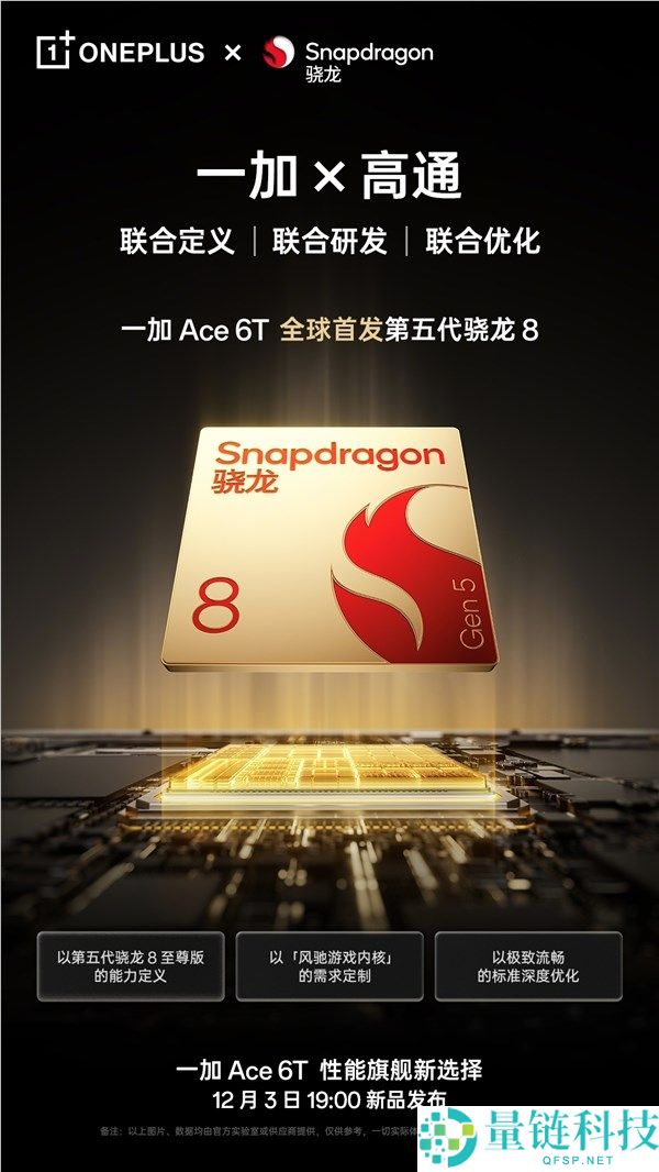 11月27日消息,一加中国区总裁李杰预热一加Ace 6T,该机全球首发骁龙8 Gen5平台(第五代骁龙8),这颗芯片由一加和高通联合定义。李杰表