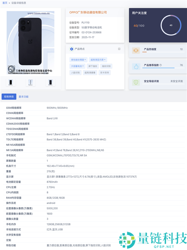 1月5日消息,型号为PLY110的一加5G新机现身电信设备终端网,证件照已同步公布。综合外观设计与型号定位,该机大概率归属Turbo系列,或将以