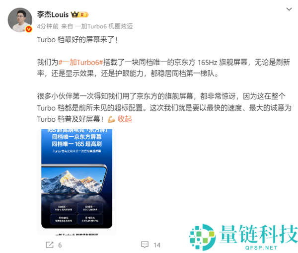 一加Turbo 6搭载同档独一京东方165Hz旗舰屏 媲美友商4K+旗舰