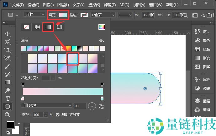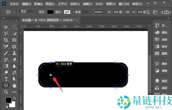1、首先我们用【圆角矩形工具】画出一个360*100像素的圆角形状,如图所示。