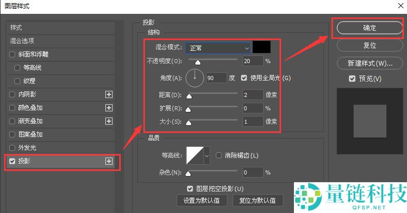 6、我们选中文字图层,然后给它添加一个黑色的投影,把不透明度调整20%、距离为2像素,大小为1像素,点击【确定】,如图所示。