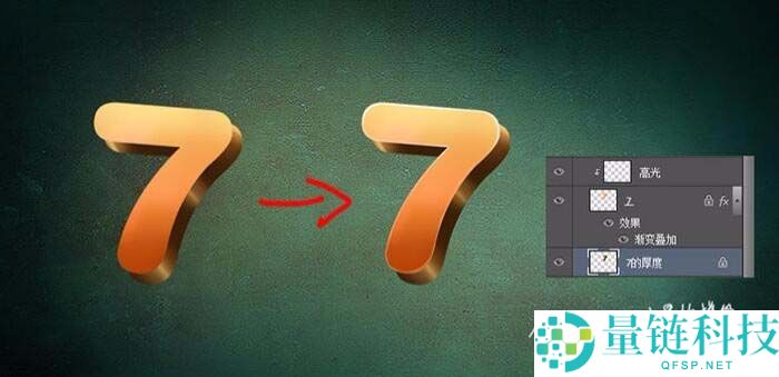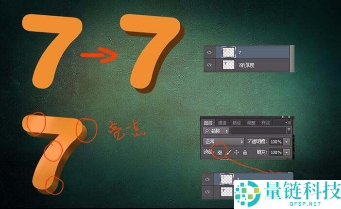 5、下一步让字体变得立体,以七为例,CTRL+J复制一层,CTRL+左键点击下面的图层,然后填充一个深色,把下面的图层向左下移动一部分,呈现如下图所示的感觉。然后点击图层上面锁定的小按钮,这样我们就可以只在图层内画过度而不会溢出来啦,给7和它的百度分别画上亮面,这面主要集中在中间和两端倒角的地方(用30号柔角画笔)
