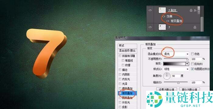 8、感觉作品还缺点感觉,以7为例,给它加一个图层效果,选择渐变叠加,模糊模式改为柔光,如下图: