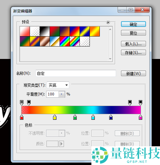 8、在弹出的“渐变编辑器”里选择需要的颜色——“确定”——拖动鼠标得到渐变后的文字;