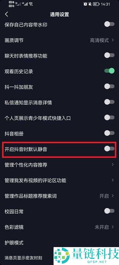 4、最后就可以在该功能界面中的下方找到【开启抖音时默认静音】点击打开就可以设置为静音。