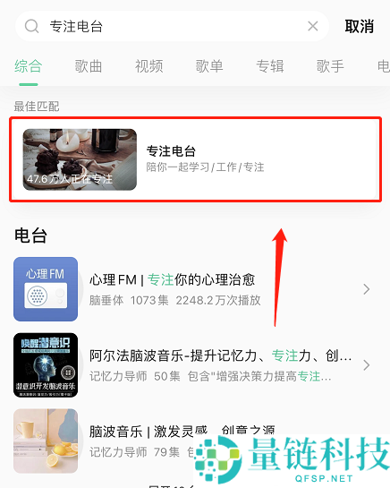 2、然后在此输入专注电台进入搜索,最上方就是专注模式入口。