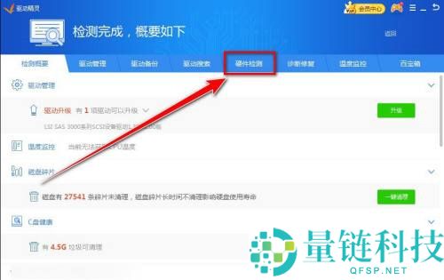 2、然后在“检测”窗口里,点击“硬件检测”选项卡。