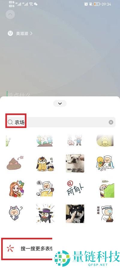 5、在其中输入【农场】,再出现的结果中上划到最下方,就可以看到【搜一搜更多表情】点击进入;