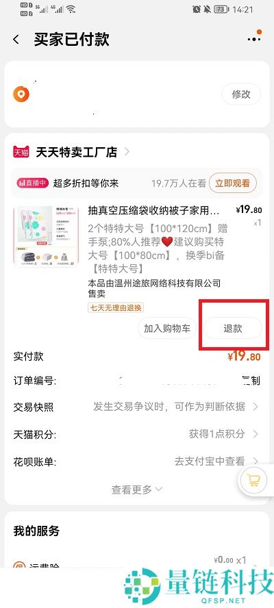 4、然后在订单详情界面中,用户就可以点击其中的【退款】进行退款;