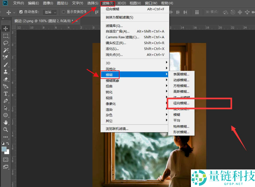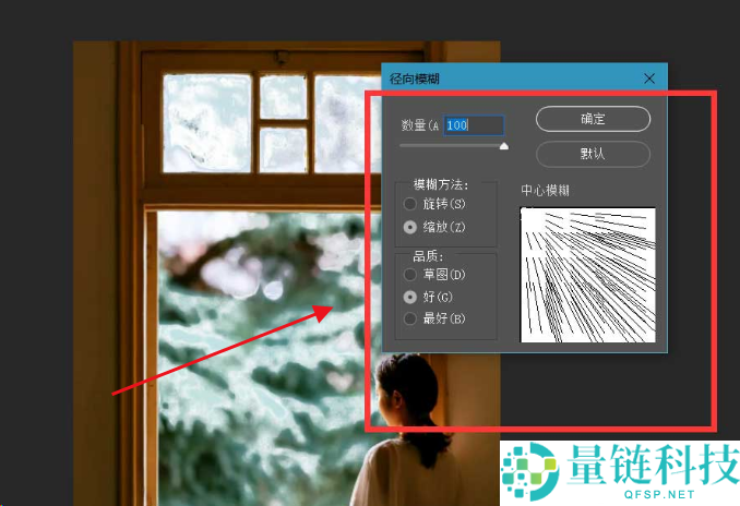 3.接着新建一个白色填充图层,找到滤镜菜单的模糊栏目,添加径向模糊效果;