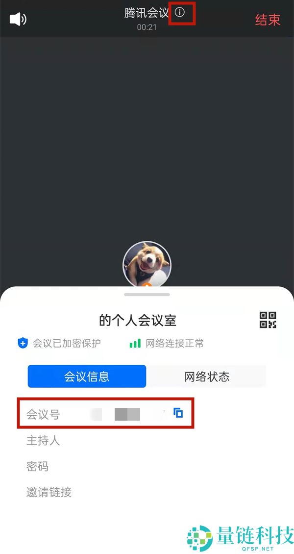 2、在会议界面,点击感叹号图标即可查看会议号(如图所示)。