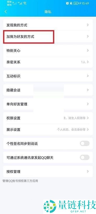 4、最后在其功能界面就可以看到其中的【加我为好友的方式】进入设置即可。