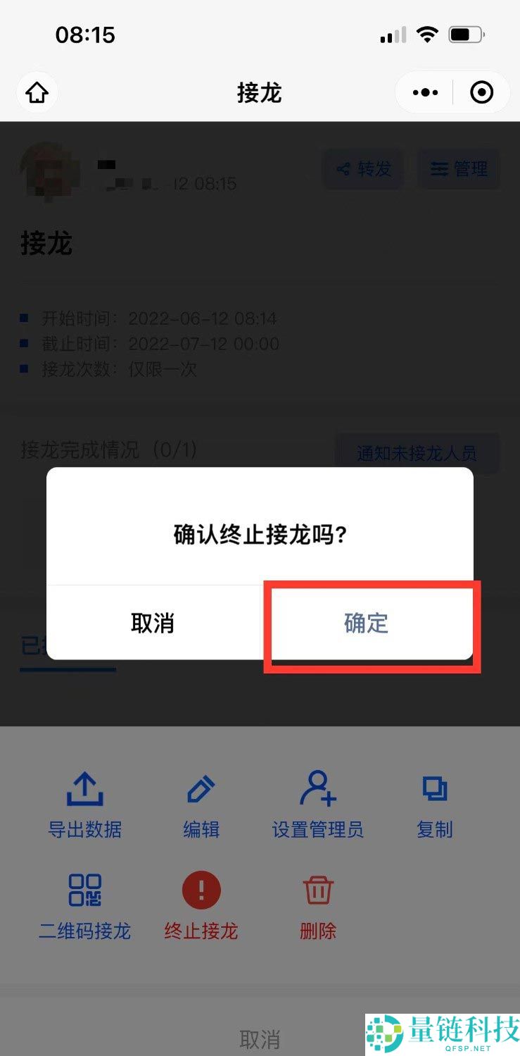 4、最后选择确定选项即可截止该群接龙(注:该方法适用于微信接龙小程序,微信自带的接龙功能,在目前微信最新版本8.0.23中,是无法截止的)。