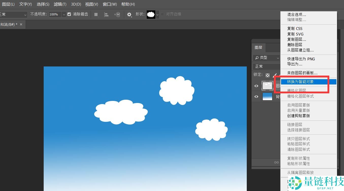 3、接着,我们用自定义形状工具中的云朵图形,设置属性为像素,在画布上画几朵云彩。然后在云朵图层上右击,选择【转换为智能对象】。
