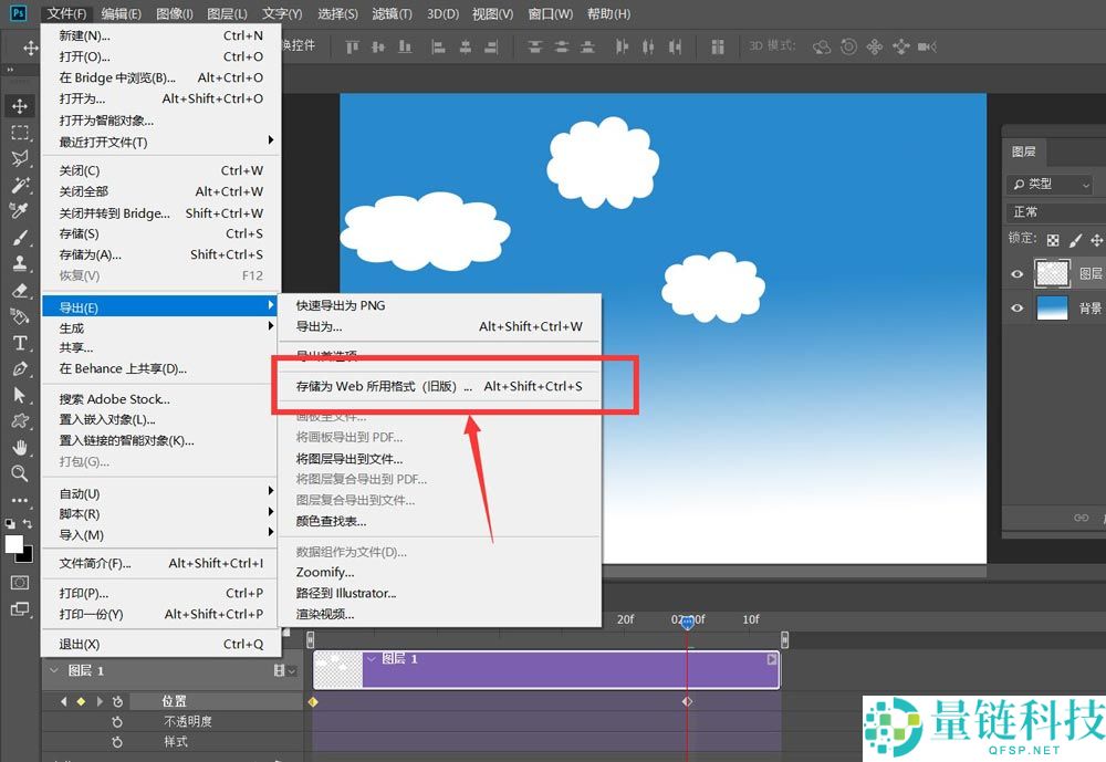 6、最后,我们调整好时间轴长度,点击左上角【文件】——【导出】——【存储为web所用格式】,如下图所示,云朵飘动效果完成了。