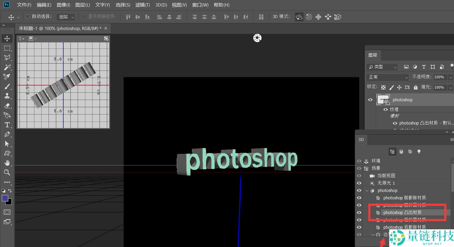 5、接着如下图所示,我们在3D面板找到【凸出材质】选项,双击打开属性面板。