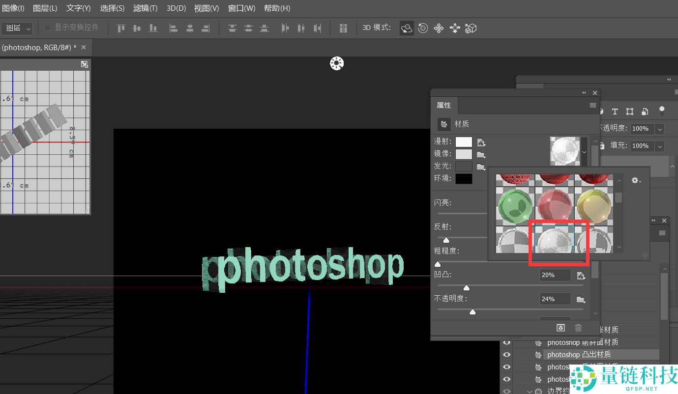 6、最后如下图,我们在属性面板找到【透明】/【玻璃】材质选项,设置合适的参数值,这样,透明3D字效就完成了。