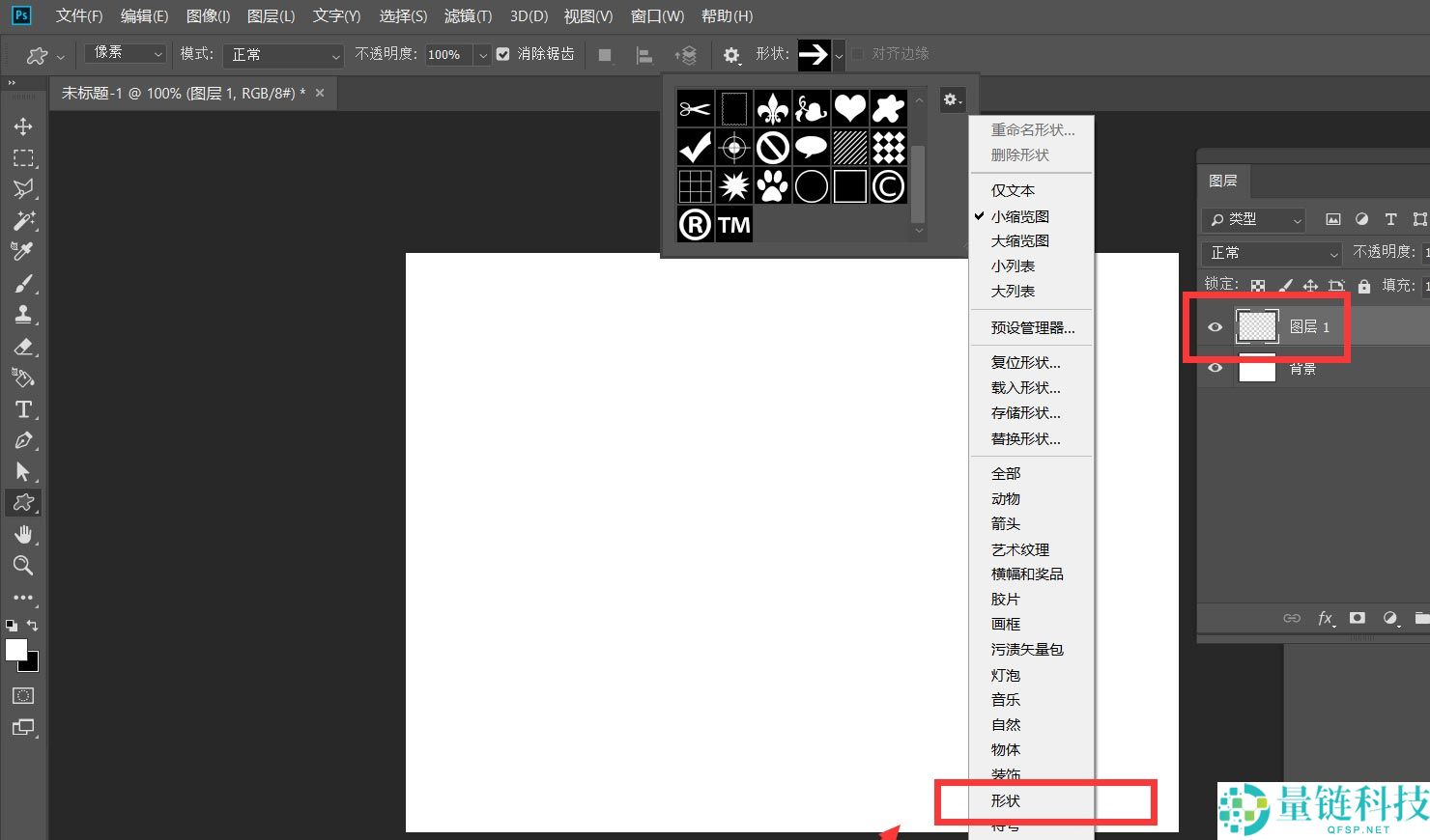 2、然后,我们新建空白图层,选择自定义形状工具,找到设置中的【形状】选项。