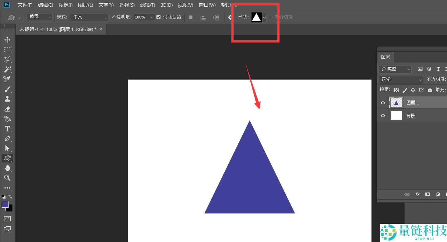 3、如下图所示,我们选择喜欢的颜色,设置形状的属性为【像素】,在画布上画一个三角形。