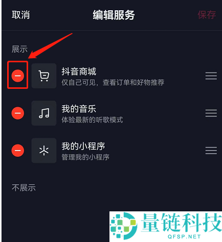 3、接着在此页面中点击抖音商城前方的-号。