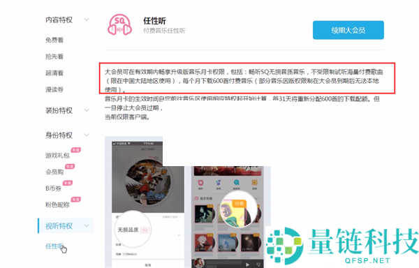 可在有效期内畅享升级版音乐月卡权限,包括:畅听SQ无损音质音乐,不受限制试听海量付费歌曲(限在中国大陆地区使用),每个月下载600首付费音乐(部分音乐因版权限制在大会员到期后无法本地使用)。