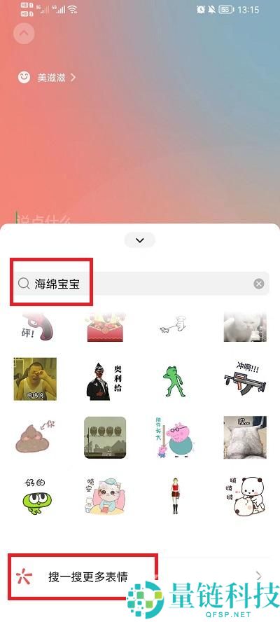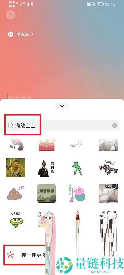 5、在搜索框中输入【海绵宝宝】然后再出现的很多表情中上划,找到最下方的【搜一搜更多表情】进入到更多表情界面;