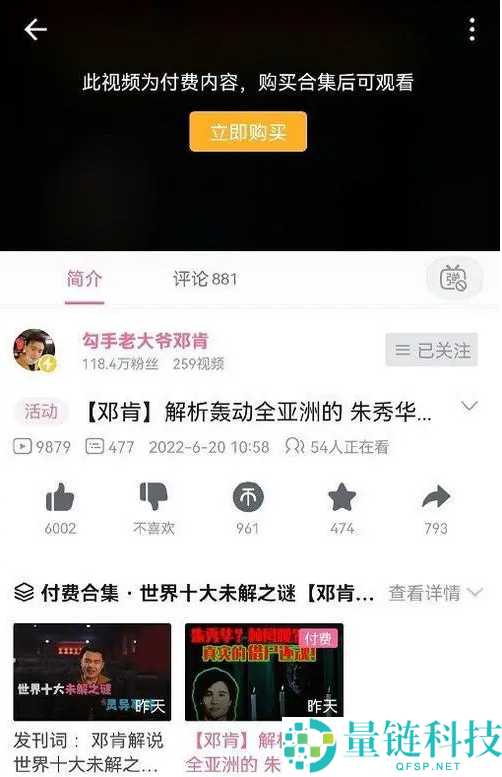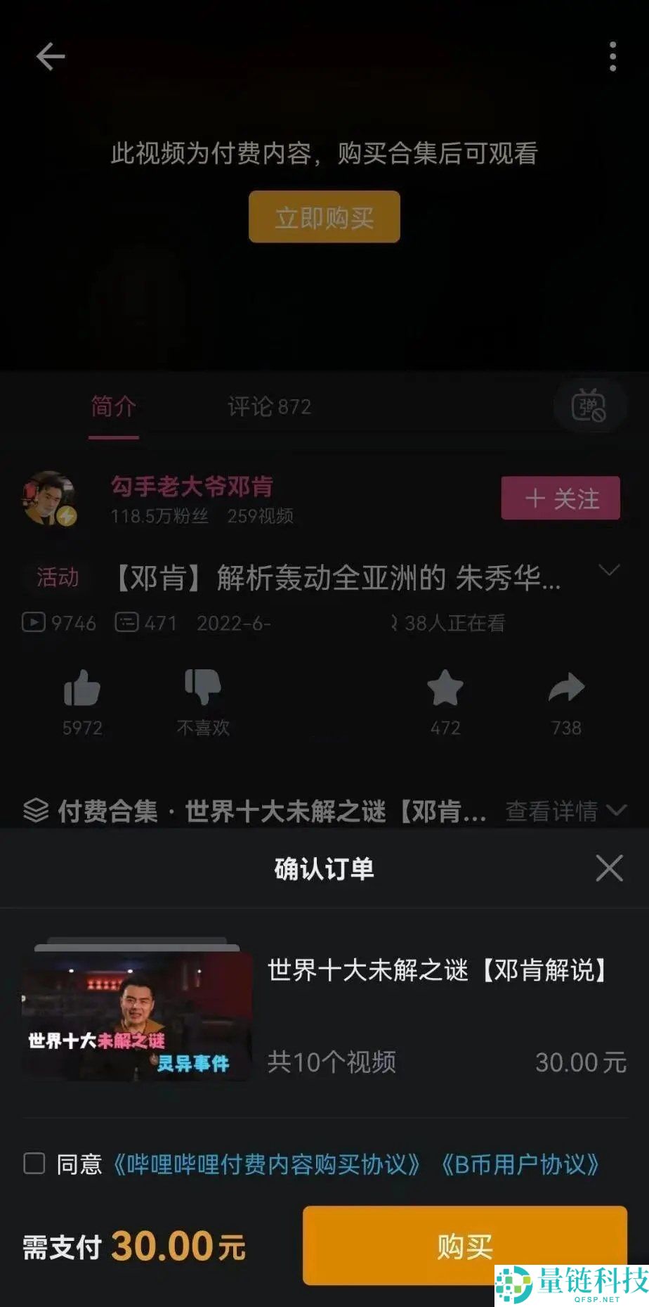 2、据了解,知名视频网站哔哩哔哩近日正式上线了付费视频功能,一位拥有118.4万粉丝的UP主「勾手老大爷邓肯」上传了一个【世界十大未解之谜】合集内容,十集内容共收费30元,最新一期视频发布一天后收到了1.2万次观看。