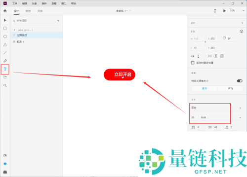 2、然后选择工具栏中的【文字工具】,输入【立即开启】,在右侧设置文字的颜色和大小。