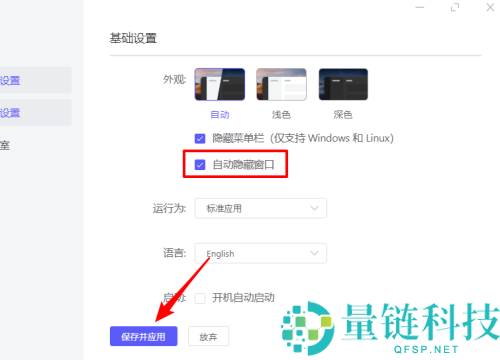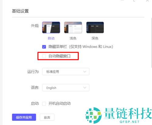 5、勾选【自动隐藏】,点【保存并应用】。一定记得点保存并应用,否则设置不会生效。
