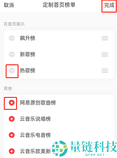 3、最后点击减号删除榜单,点击加号添加榜单,点击右上角完成即可。