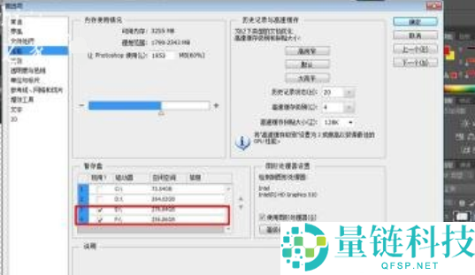 2.然后点击性能选项卡,在暂存盘下选择除C盘外空间较大的盘,最好多选几个。