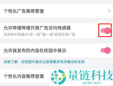 3、最后将允许哔哩哔哩开屏广告访问传感器右侧开关关闭即可。